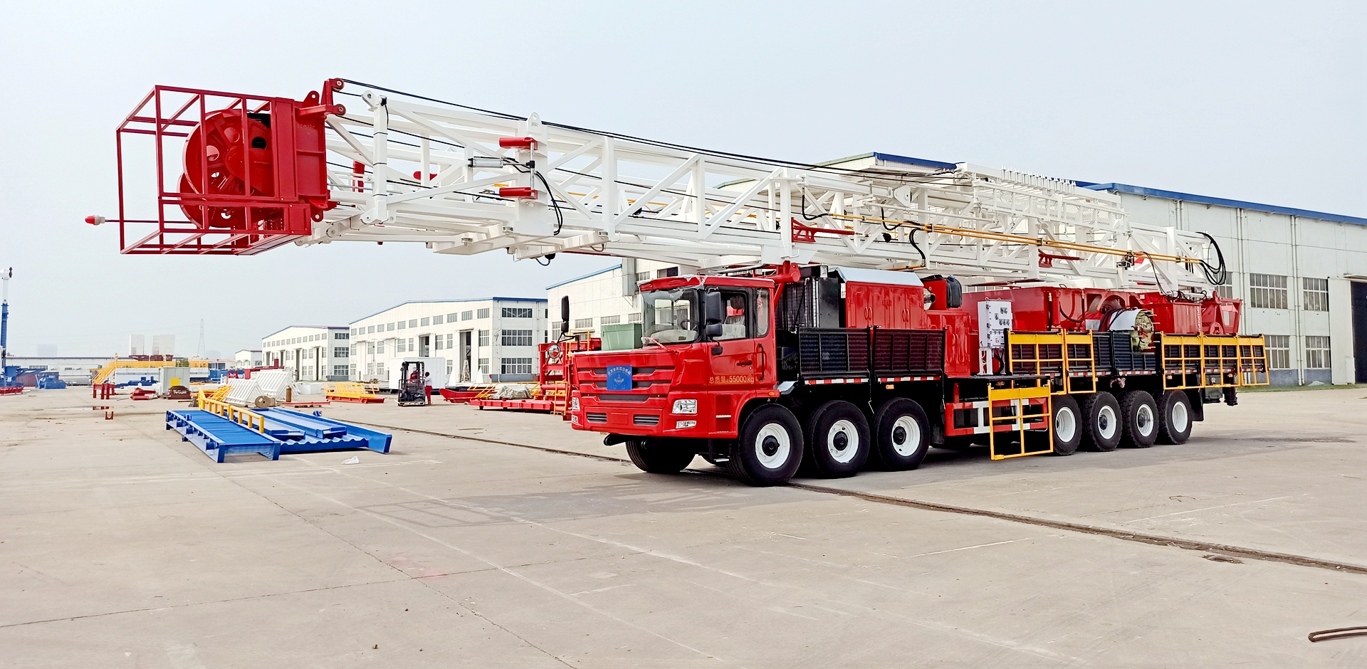 拖裝鉆機的動力、絞車、井架、游車系統及傳動機構全部裝載于半掛底盤上,移運時用牽引車拖掛移運至現場,該類產品對于提高鉆井作業搬遷效率具有很大的優勢,適應于中淺井鉆井作業。